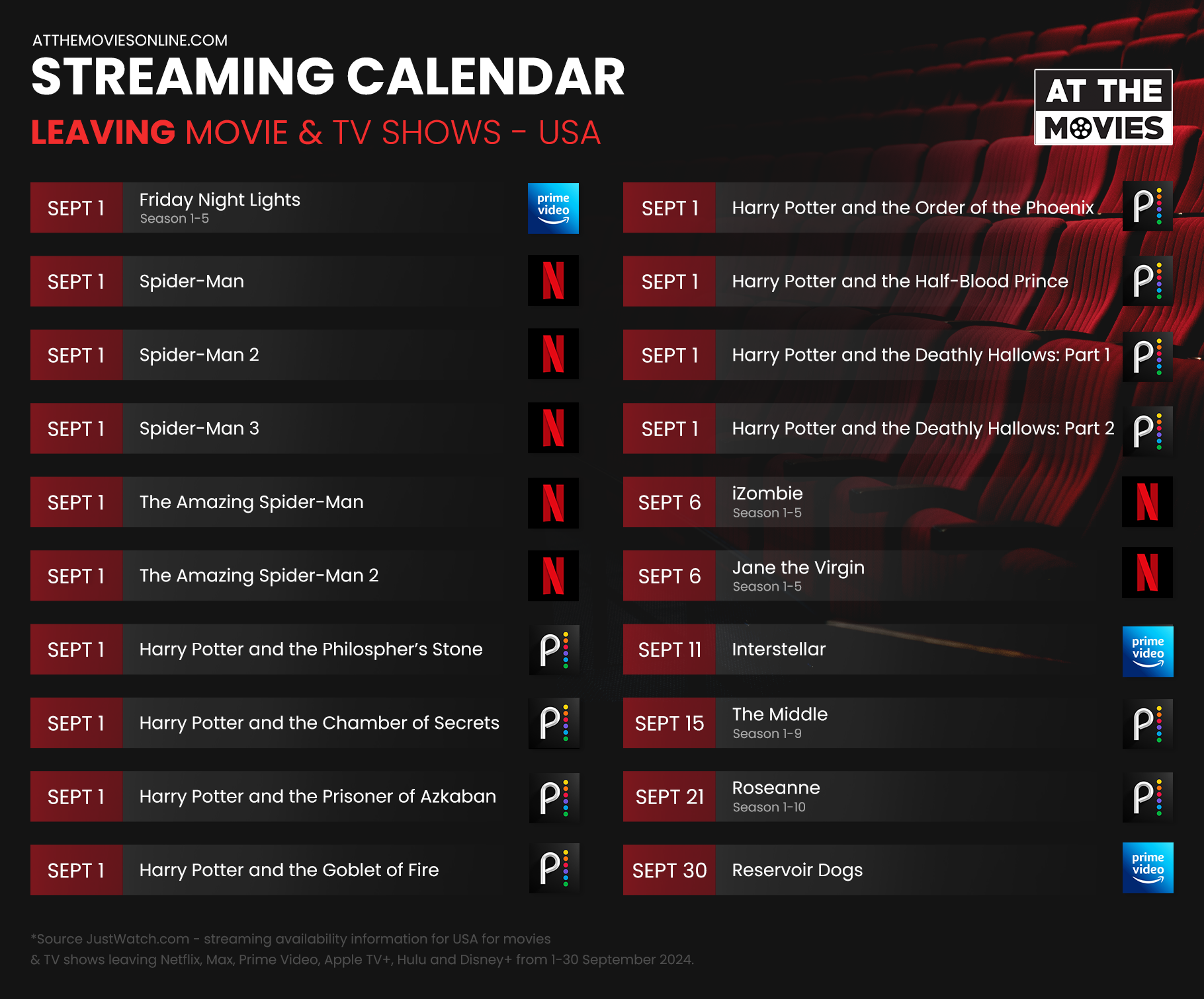 Streaming Calendar_Upcoming_SEPT Streaming Calendar_Leaving_SEPT on September 23, 2024 0Likes At The Movies ShareTwitterFacebookInstagram Post navigation Previous post: September Streaming Movie & TV ShowsSeptember 23, 2024